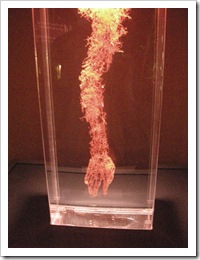 Här till höger visas en hel arm (handen längst ner) i form av enbart alla blodkärl - men bilden ger inte rättvisa åt 3D-effekten i verkligheten. Man har lyckats göra på detta vis genom en helt unik process som heter plastination. Man sprutar in ett material i ådrorna som färglägger allt och sedan härdar. Efter det kan man med andra kemiska processer avlägsna allt övrigt kött på armen.